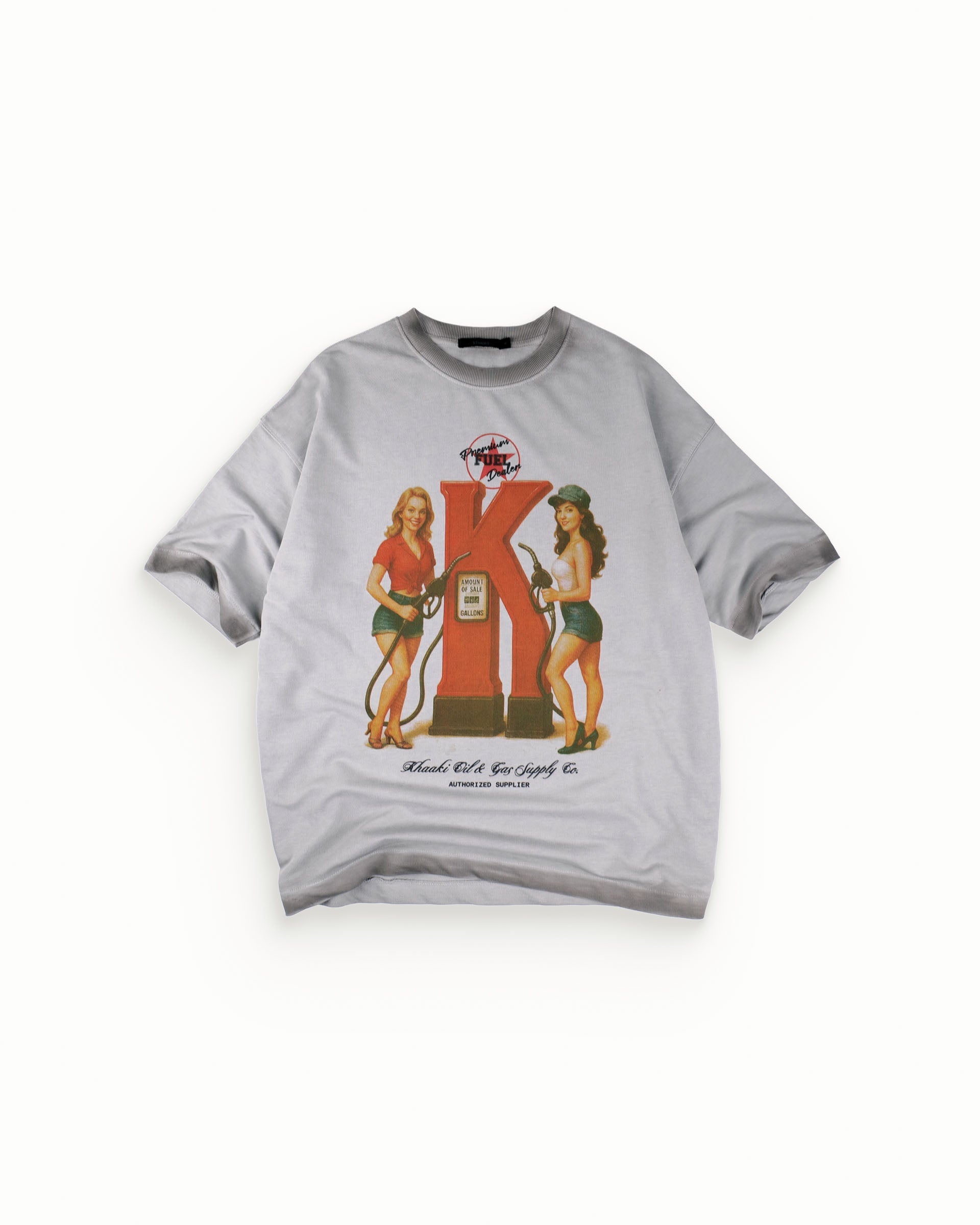 Premium Fuel - Authorised Supplier T-shirt, crafted from 100% Cotton Terry Looper in a sturdy 250 GSM. This faded washed grey oversized t-shirt features a bold retro graphic print of a vintage pump station, symbolizing energy and drive. The cold pigment washing process delivers a unique, worn-in texture that enhances its vintage and nostalgic vibe, making every piece one-of-a-kind.
