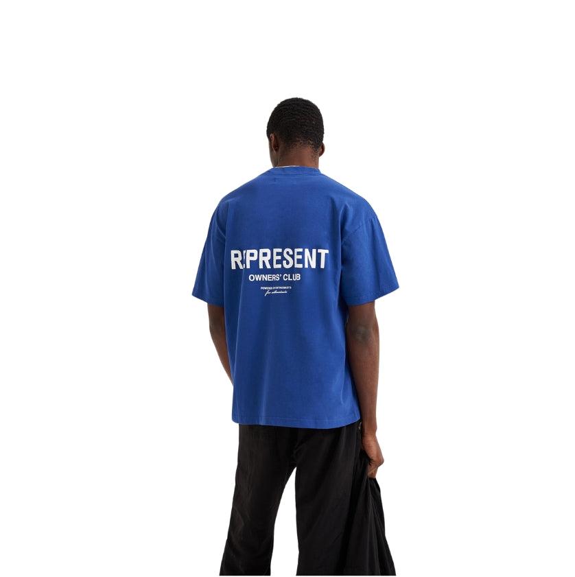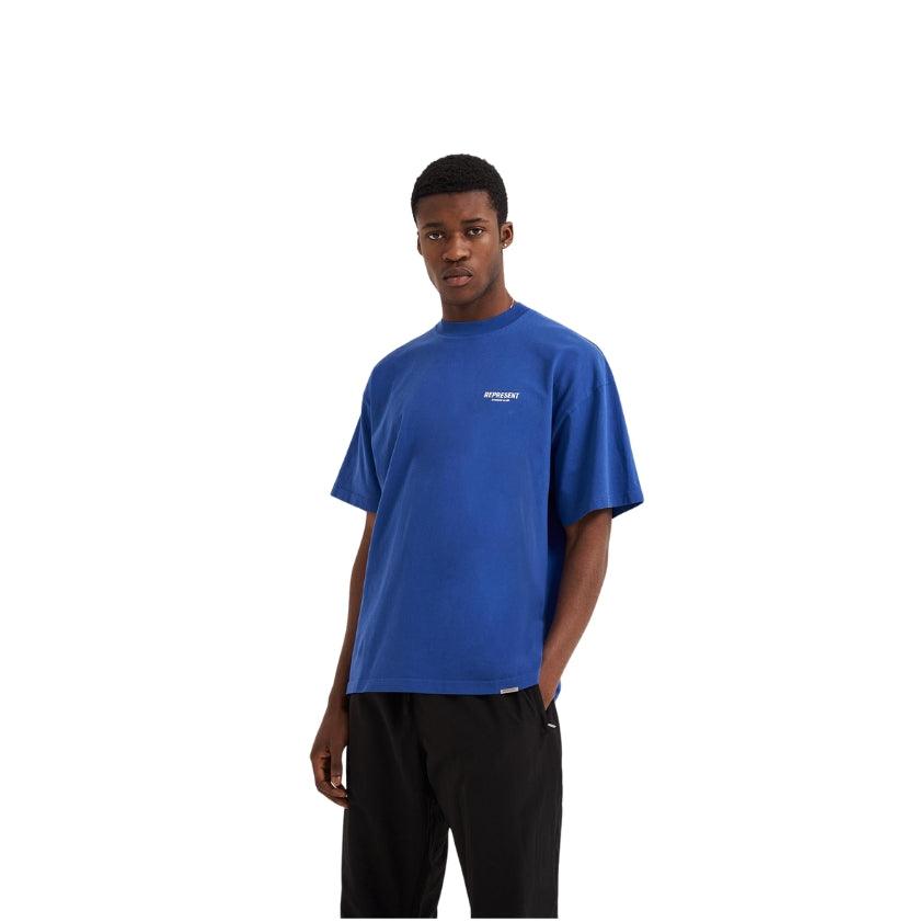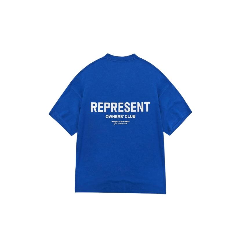 Short sleeve jersey cobalt blue t-shirt. Slightly oversized fit in a medium weight cotton. Ribbed crewneck collar. Represent Owners Club graphic branding to the rear and chest. This blue t-shirt is finished with our metal bar logo to the hem.