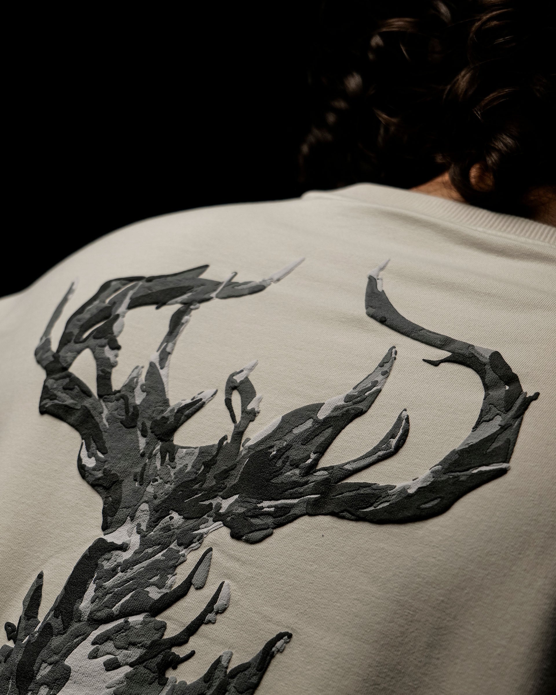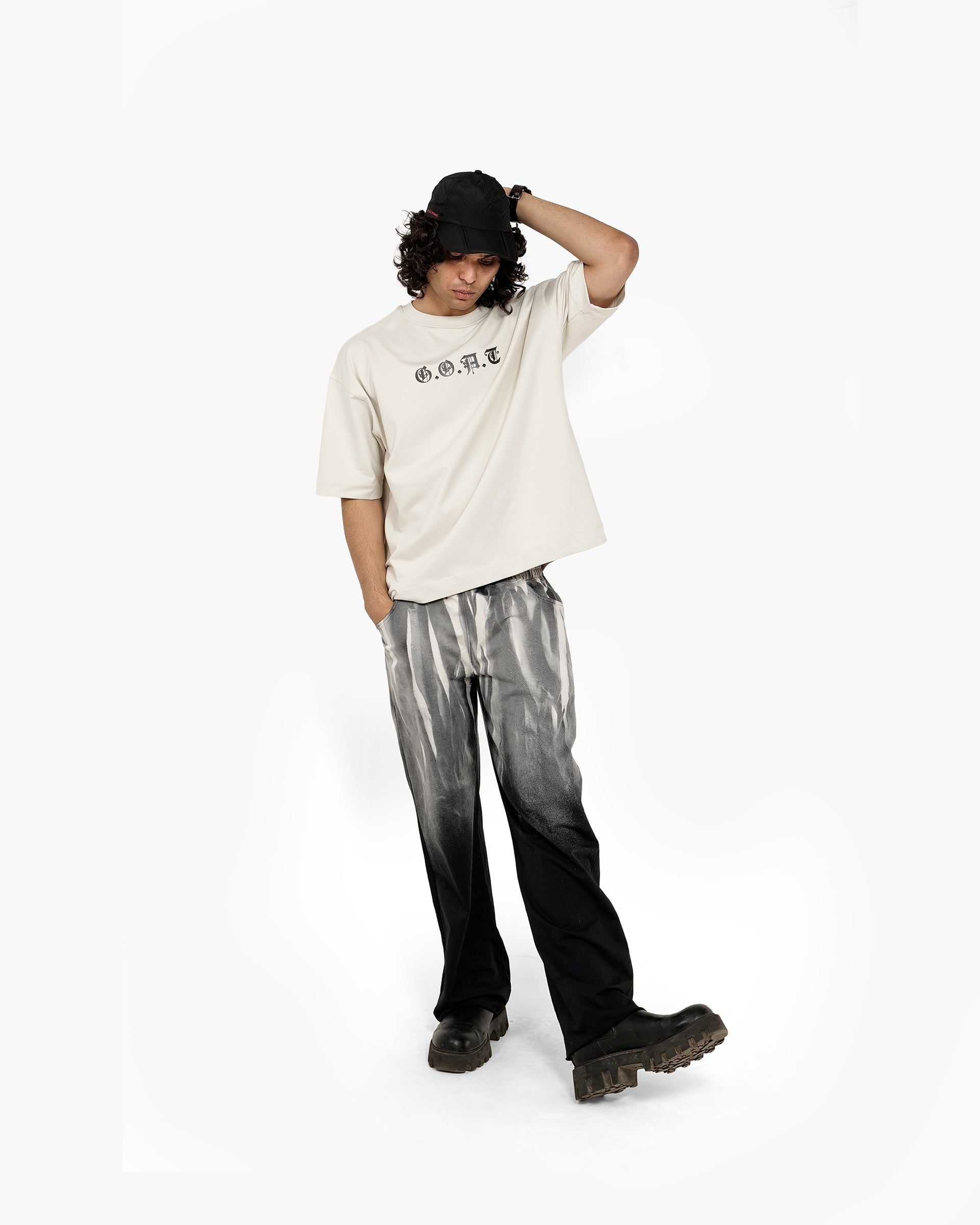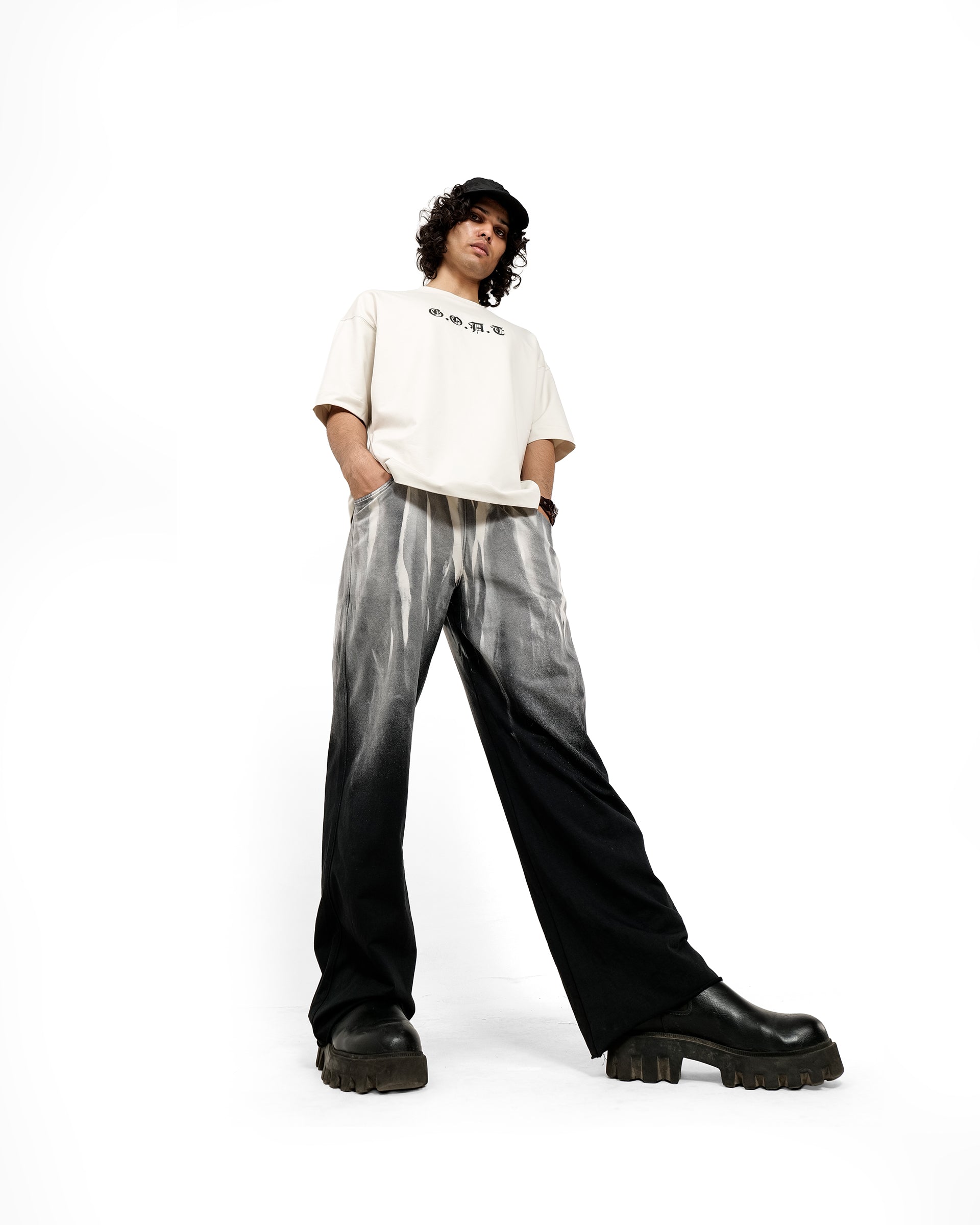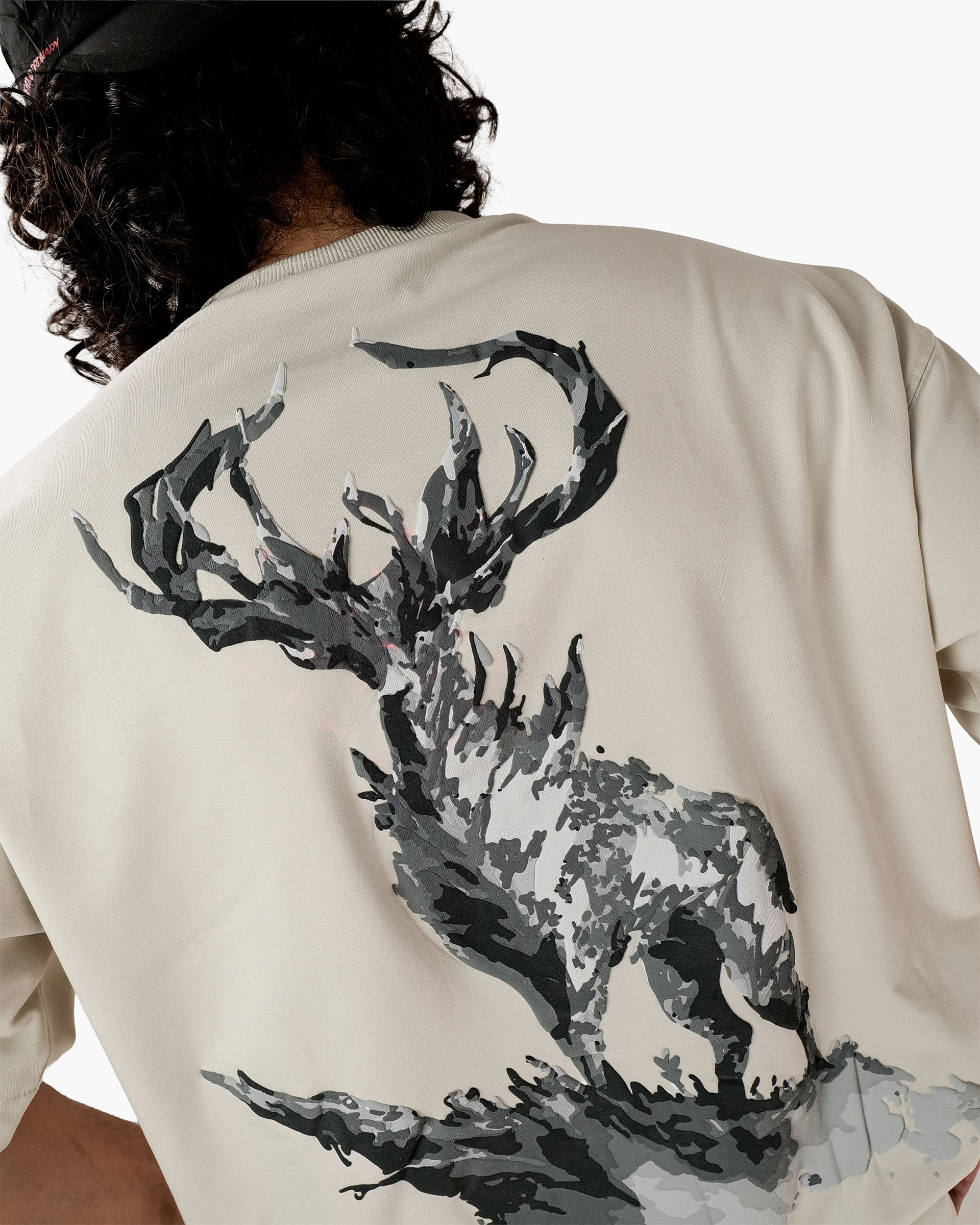 Crafted for the bold, The Summit G.O.A.T. is a premium oversized T-shirt that symbolizes dominance, grace, and quiet power. Featuring a washed ivory canvas, the front boasts “G.O.A.T” in gothic serif lettering, while the back showcases a majestic monochrome stag standing high on a cliff — an embodiment of strength, vision, and strong mindset.
