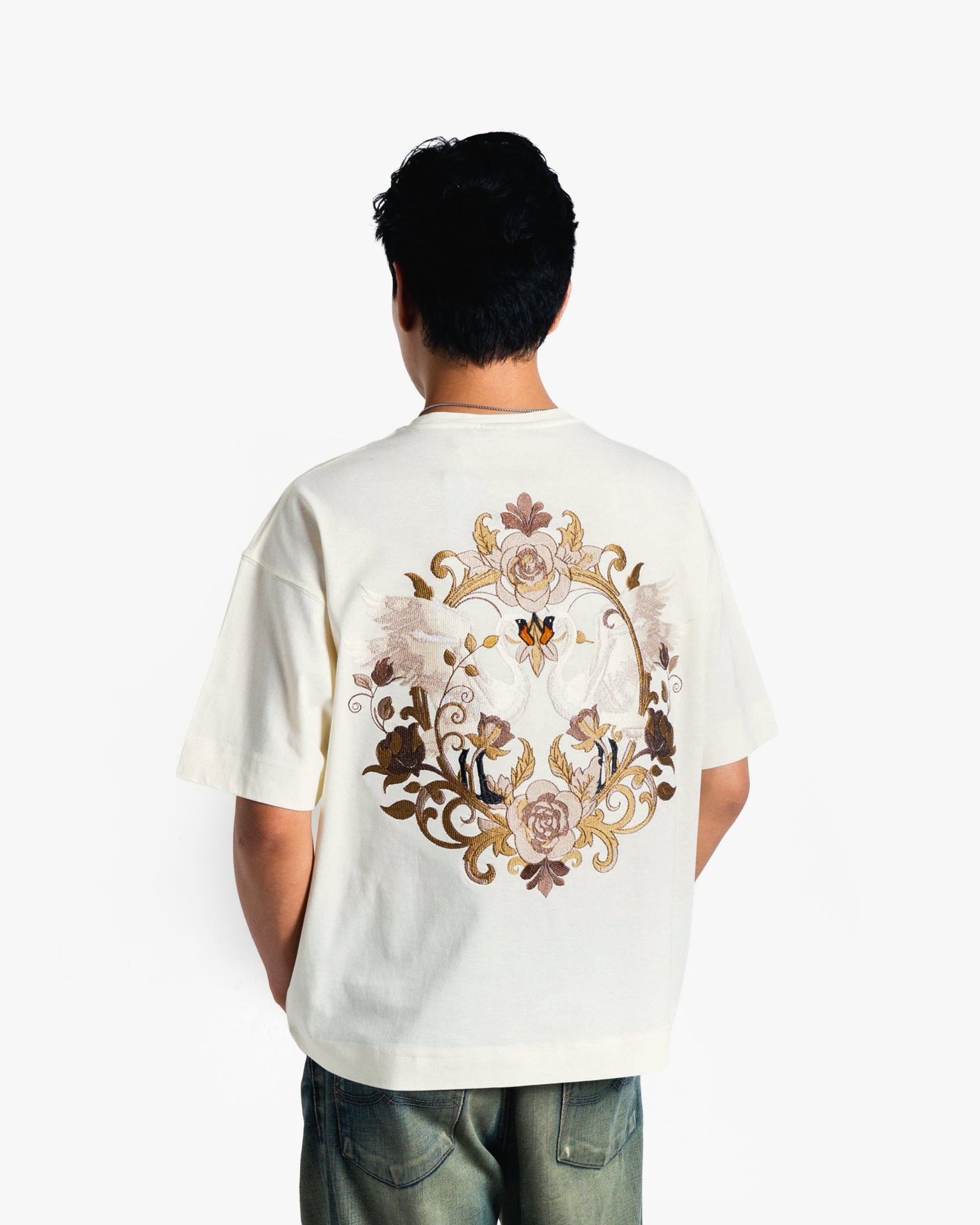 The Swan Opera — a premium oversized unisex t-shirt in Off White, adorned with an intricate full-back and front embroidery that commands attention.