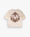 Crafted from heavyweight 100% mercerized cotton and finished with a luxurious double silicone wash, this piece showcases nearly 3 lakh embroidery stitches in earthy tones, weaving a regal scene of swans, roses, and vintage baroque flourishes. The detailed embroidery on the chest adds a refined contrast, perfectly tying in with the majestic full-back artwork.