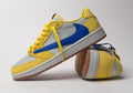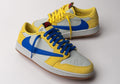 Buy Travis Scott x Air Jordan 1 Retro Low OG SP 'Canary' in India from copyourdrip.com, The Travis Scott x Women's Air Jordan 1 Retro Low OG SP 'Canary' showcases the Houston rapper's signature reverse Swoosh, cropped and finished in Racer Blue adorning the lateral side of the shoe. A white leather upper is contrasted with yellow overlays at the forefoot and heel. A red and black Nike Air tag adorns the tongue, while mismatched Cactus Jack and Wings branding is embroidered on the heel tab of each shoe. The sneaker is underpinned by a traditional cupsole, highlighted by white textured sidewalls and a gum rubber outsole.
