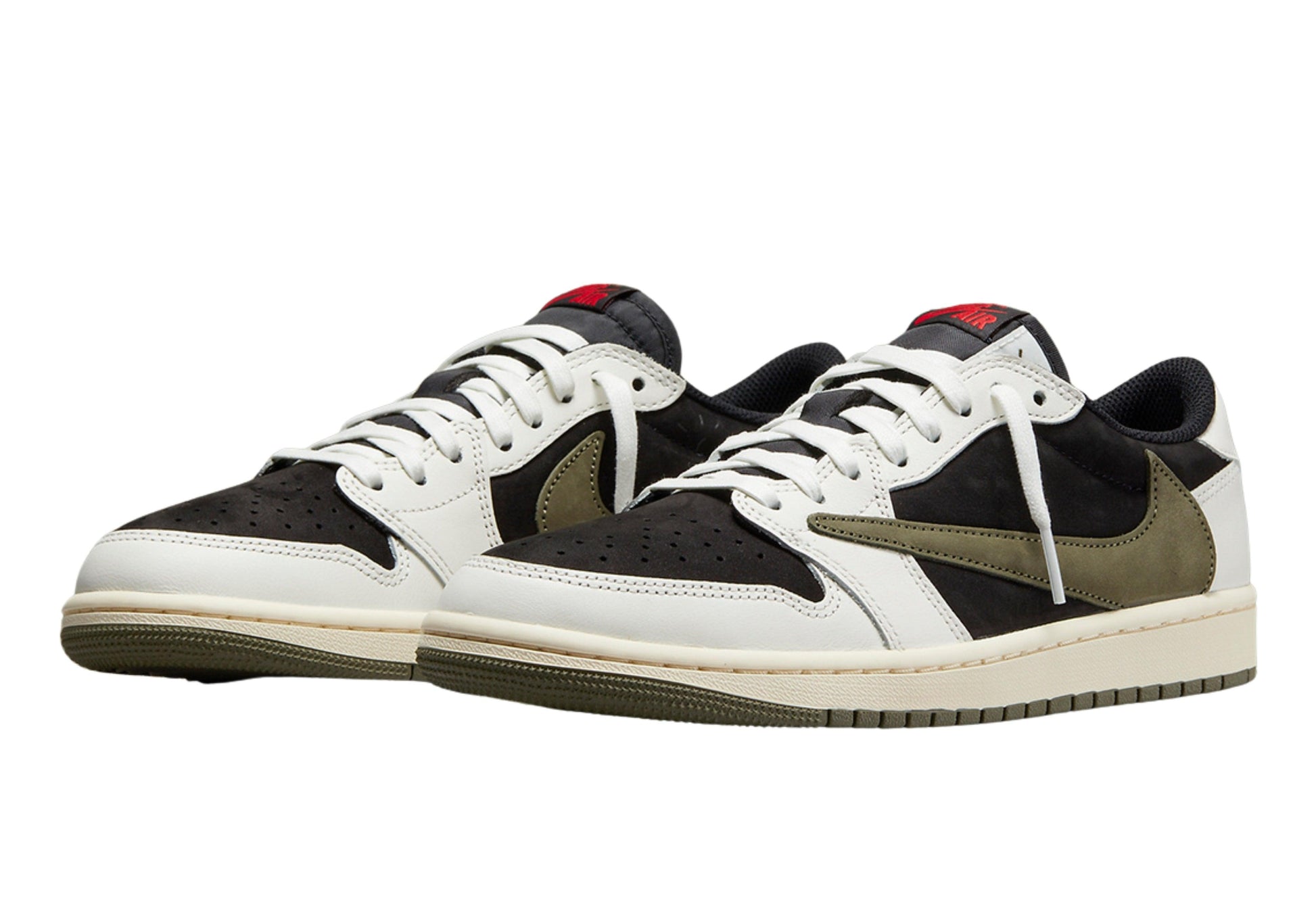 Buy Travis Scott x Wmns Air Jordan 1 Retro Low OG SP 'Olive' in India from copyourdrip.com , The Travis Scott x Women’s Air Jordan 1 Retro Low OG SP ‘Olive’ presents the chart-topping rapper’s first sneaker collaboration in female sizing. The upper combines a black suede base with off-white leather overlays and olive suede Swooshes, featuring a reverse check on the lateral side and a traditional design on the opposite side. The neutral earth tones are punctuated by bold crimson accents, highlighted by woven Nike Air tongue tags and mismatched Jordan and Cactus Jack branding on each heel tab. Anchoring the low-top is a rubber cupsole that pairs vintage off-white sidewalls with an olive green rubber outsole.