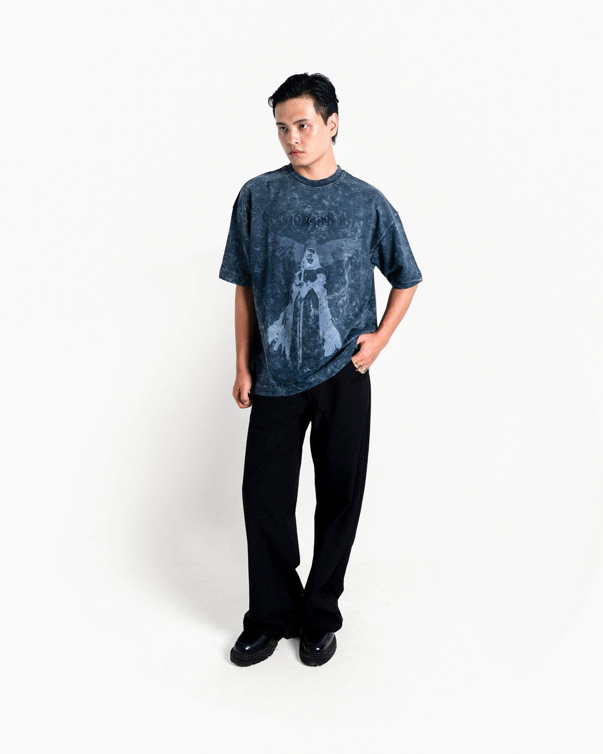 The artwork features a divine figure in prayer, wings spread as if echoing chants into the dusk. Subtle yet commanding, the faded print merges seamlessly with the garment’s washed finish, creating a design that feels both timeless and ethereal.