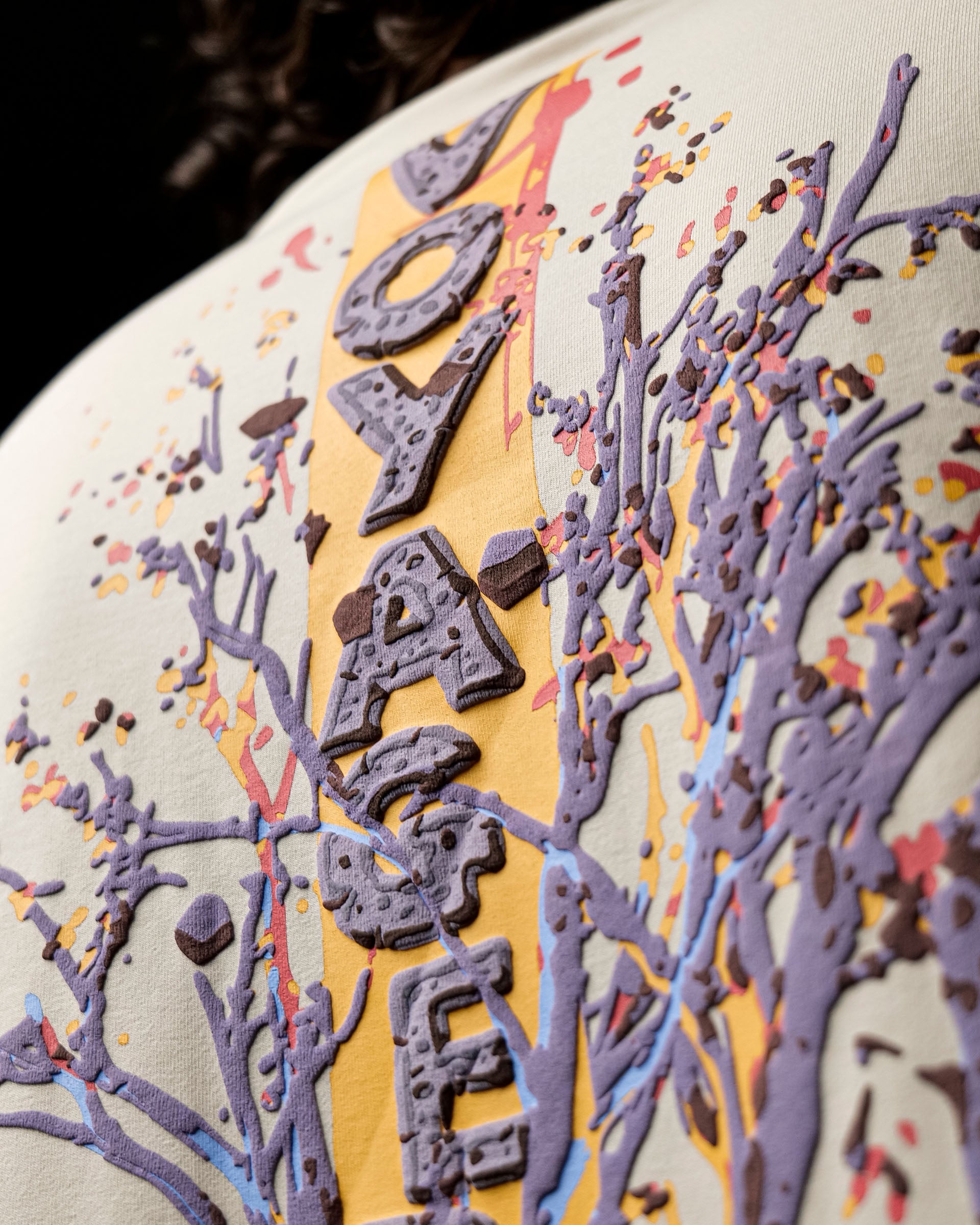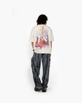 Premium oversized unisex T-shirt crafted from Cotton Spandex Terry Looper. This piece showcases a bold and immersive back graphic that blends post-apocalyptic ruins with surreal nature, where a lone explorer in a yellow coat gazes up at a towering tree springing from red rock. The vivid 3D puff print brings texture and life to every detail—from the purple trees and golden-yellow trunk to the striking vertical “VOYAGER” monolith rising through the center.