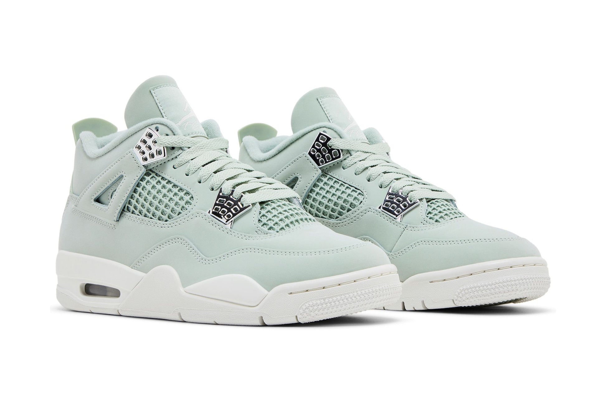 The Women's Air Jordan 4 Retro 'Abundance / Seafoam' showcases a pale green hue on the upper, crafted from smooth leather with breathable quarter panel netting. Tonal Jumpman branding adorns the woven tongue tag and heel tab. The monochrome design is interrupted by molded eyelets in a gleaming metallic silver finish. Anchoring the sneaker is an off-white polyurethane midsole, featuring a visible Air-sole unit nestled in the heel.